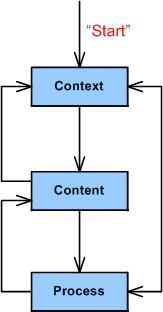 I usually start using CCP by spending a fair amount of time struggling to define the context; bounding, iterating and sketching fuzzy lines around what I think is in and what is out of scope. Next, I dive into the content sub-process; using the context info to conjure up solution candidates and simulate them in my head at the speed of thought. The first details of the process that should be employed to bring the solution out of my head and into the material world usually trickle out naturally from the info generated during the content definition sub-process. Herky-jerky, iterative jumping between CCH sub-processes, mental simulation, looping, recursion, and sketching are key activities that I perform during the execution of CCP.