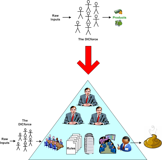 This not only happens under the “watchful eyes” of the head shed, but incredibly, those inside the shed-of-privilege are the chief proponents and instigators of all the added crap that slows down and frustrates the DICforce. Peter Drucker nailed it when he opined: