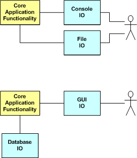 Eliminating, or at least delaying, GUI and database IO forces you to focus on getting the internal application design right early. It also helps to keep you from tangling the GUI IO and database IO code with your application code and creating an unmaintainable ball of mud. Thirdly, the practice also makes testing much simpler than trying to write and debug the whole quagmire at once. Good advice?