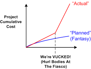 The figure below shows (in hindsight) the actual vs planned cost curve for a hypothetical “vucked” project. Cost-wise, the project started out OK, but because it was discovered that technical progress wasn’t really, uh, technical progress, bodies were thrown onto the bonfire. Again, the financial loss accumulated and accumulated until end game – whatever that means.