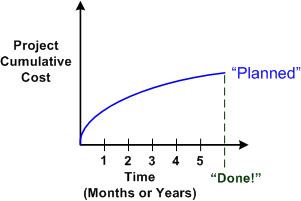 The figure below shows the shape of a pristine, planned, cost vs time profile at “project start” for a long term, resource-intensive, project to do something “big and grand for the world”. Some one or some group has consulted their crystal ball and concocted a cost vs schedule curve based on vague, subjective criteria, and bolstered by a set of ridiculously optimistic assumptions and a bogus risk register “required for signoff“. To coverup the impending calamity, the schedule has been enunciated to the troops as “aggressive“. BTW, have you ever heard of a non-aggressively scheduled big project?