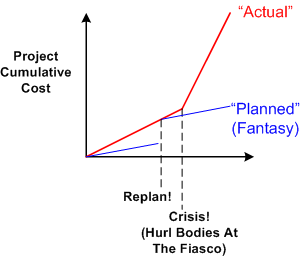 The figure below shows (in hindsight) the actual vs planned cost curve for a hypothetical “fantasy revisited” project. Cost-wise, the project started out OK (snore, snore, Zzzzz), but because it was discovered that technical progress wasn’t really, uh, technical progress, bodies were thrown on the bonfire. But his time, someone with a conscience actually fessed up (yeah, some people are like that, believe it or not) and the project was replanned in real-time, during execution. Alas, this is not Hollywood and the financial loss accumulated and accumulated until end game – whatever that means.