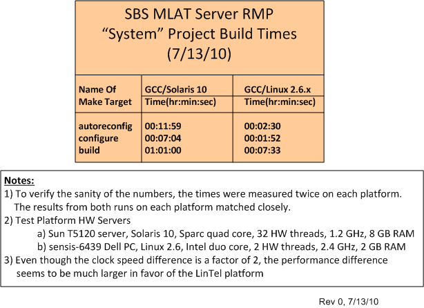 The table below quantifies what the team has been qualitatively experiencing over the past few months. Originally, our primary build and integration machine was the Solaris 10 server. However, we quickly switched over to the Linux server as soon as we started noticing the performance difference. Now, we only build and test on the Solaris 10 server when we absolutely have to.
