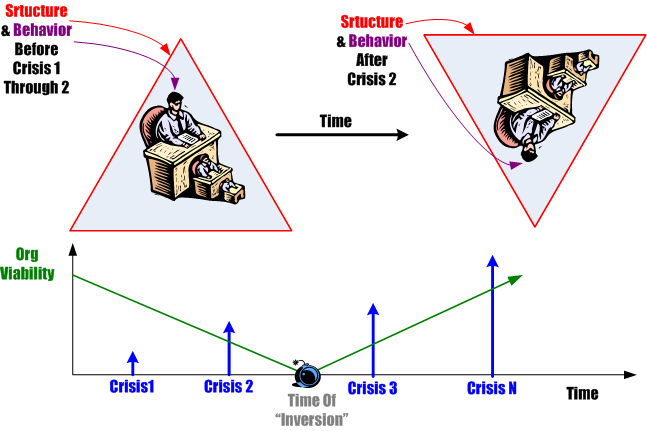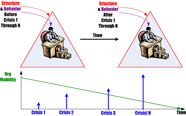The figure below shows what maybe should happen when crises occur and learning takes place? Someone or some group willingly steps up to positively change the structures and behaviors so that the org can smoothly navigate through, and even thrive within, future crises. In the example below, it took 2 crises to stave off  self destruction, right the course, and excel in the future. Alas, the problem with the previous sentence is the “someone or some group” phrase at the beginning.