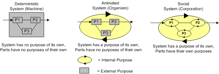 Ackoff states that modeling a system of one type with the wrong type for the purpose of improving or replacing it is the cause of epic failures. For example, attempting to model a social system as a deterministic system with an underlying mathematical model causes erroneous actions and decisions to be made by ignoring the purposes of the parts. Human purposes cannot be modeled with equations. Likewise, modeling a social system as an animated system also ignores the purposes of the many parts. These mismatches assume the purposes of the parts align with each other and the purpose of the whole. Bad assumption, no?