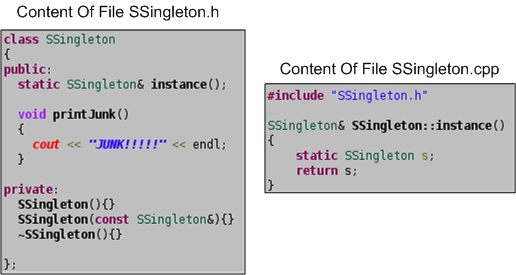 Post-picture insertion notes: 1) I shoulda named the variables in the main() of the pointer version of the singleton sPtr1 and sPtr2. 2). For consistency, I prolly shoulda made the copy assignment operator function private in both implementations. Is there anything else I could do to improve the code?