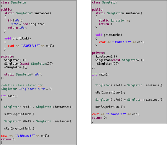 Because C++ has both pointers and references, there are two ways to implement a singleton. The programs below show the difference between the approaches (I know, I know. I could’ve used a smart pointer on the left). Since references can’t be “accidently” deleted by client code, I prefer the reference method on the right. Plus, there’s no need for an “if” test every time the singleton’s handle is retrieved by client code.