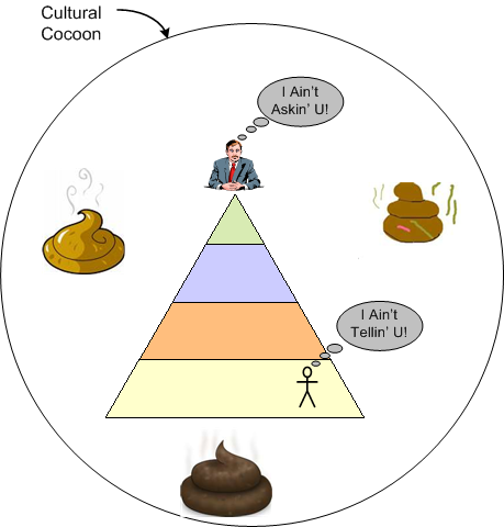 The corpocratic version of the “don’t ask don’t tell” policy is “SCOLs don’t ask what’s wrong, DICs don’t tell what’s wrong“. SCOLs, CGHs, BUTTs, and BOOGLs ensconced in self-images of infallibility don’t need to ask because they always know:
