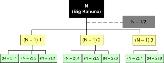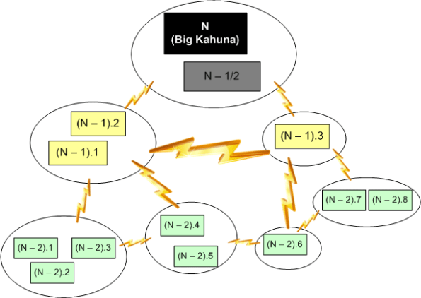 The figure below shows the top three levels of an N level textbook corparchy. Virtually all corpo monarchs present some visual camouflage like this to model their beloved corpricracy. The massive illusions that a diagram like this intends to project are: