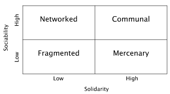 Mr. Taylor’s model, and he stresses that it’s just a model, partitions corpo cultures into four archetypes: communal, mercenary, networked, and fragmented. The criteria he uses to diagnose a culture are sociability and solidarity: