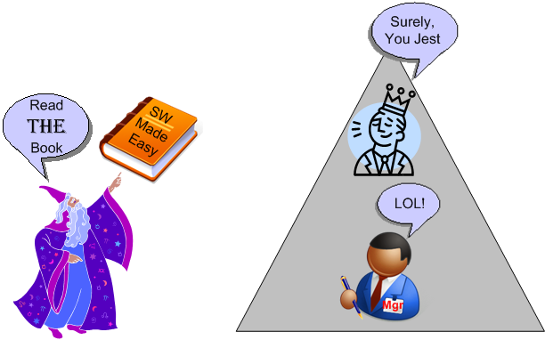 Besides being targeted at other patronizing know-it-alls by a fellow patronizing know-it-all, one hidden assumption in these words is that “senior executives and managers” actually care about understanding and trying to solve the nasty socio-technical problems that are weaved into the fabric of every large software development project. Another unspoken assumption is that “senior executives and managers“, with their five minute attention spans and disdain for immersive and sustained thinking, would read a whole book – let alone a tome promoting yet another “successful” software development process.
