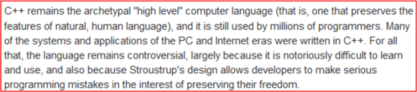 C++ has indeed become too “expert friendly” at a time where the degree of effective formal education of the average software developer has declined. – Bjarne Stroustrup