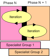 As the figure below illustrates, an alternative to the one-shot, review-based project is the continuous review-based project. The “official” review is still held at a discrete point in time, but since collaborative inter-group communications were initiated well before the review, specialist group 2 will experience fewer “surprises” at review time.