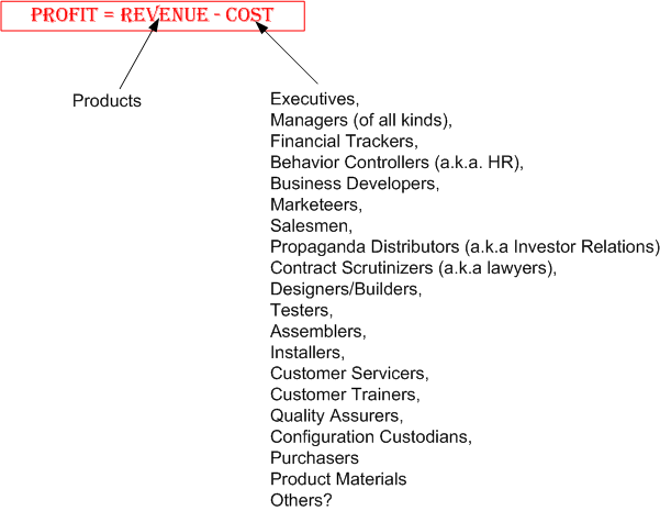 When a company starts up, by definition, it has only a handful of people who fulfill all of the roles in the right hand side of the above figure needed to prosper and develop. Over time, “approved” micro-specialization, infectious hubris, empire-building, and a whole lotta BS accompanies the obsession to”grow the enterprise“. These sanctioned behaviors usually (but not always) lead to an unsustainable and cost heavy behemoth that brings the party to an end – all under the eyes of the self-proclaimed brilliant dudes who run the show. Bummer.