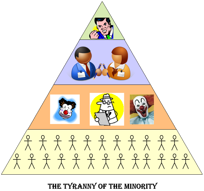 Given the choice between “tyranny of the majority” and “tyranny of the minority“, I’d choose the former every time – especially when the minority is a junta in the latter case. In representational democracies like the good ole USA, the “representational” aspect decreases the chance of being governed by the “tyranny of the majority“. In really bad corpricracies, the “tyranny of the minority” is the rule and, since it’s a subtle form of tyranny, everyone up and down the ladder of importance accepts it in quiet desperation – with no questions asked.