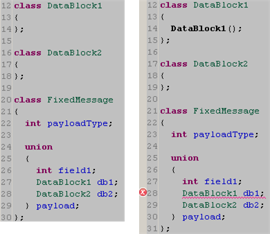 Unlike the code on the left, which has empty compiler-generated ctor, dtor, and copy operations, the DataBlock1 class on the right has a user-declared ctor – which trips up the compiler even though it is empty. When an object of FixedMessage type is created or destroyed, the compiler wouldn’t know which union member constructor or destructor to execute for the two class members in the union (built-in types like “int” don’t have ctors/dtors). D’oh!