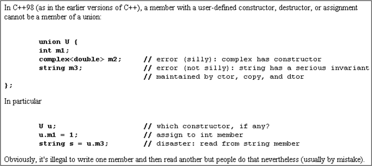 But of course, the restrictions on which user-defined types may be included in a union will be relaxed a bit in C++11. The details are in the link provided above.