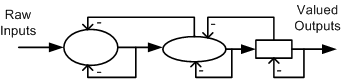 The figure below shows a 3 group system that efficiently transforms a stream of raw inputs into a stream of valued outputs (they’re valued because customers want to pay for them) via the application of talent, knowledge, and skill. In this system, since all groups are on the same horizontal plane of importance, negative feedback channels are embraced, and hence, the information that flows within them blunts the rate of increase in entropy while providing a source of reflective learning.