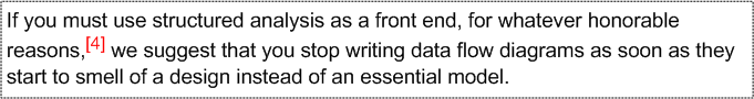 While reading the delightful “Object-Oriented Analysis and Design with Applications“, Grady Booch et al extol the virtues of object-oriented analysis over the venerable, but passe, structured analysis approach to front end system composition. As they assert below, one of the benefits of OOA is that it’s easier and more natural to avoid mixing concrete design details with abstract analysis results.