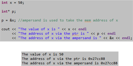 The code snippet and its associated output below show the classic, single purpose use of the “&” operator in C to obtain the “address of” an integer type identified by “x”.