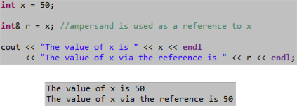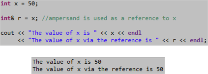 In C++, the “&” token serves two purposes. The first one is the same as in C; when applied to an identifier, it returns the “address of” the object represented by the identifier. As the code below illustrates, the second C++ use is when it is applied to a type; it represents a “reference to” (a.k.a “alias to”) an object.