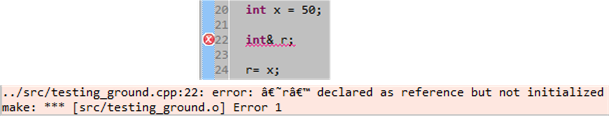 Note: I used Eclipse/cygwin/gcc over Win Vista for the code in this post. Do you see those annoying turd characters that surround the “r” in the pink compiler error output above? I’ve been trying to find out how to get rid of those pesky critters for weeks. As you can see, I’ve been unsuccessful. Can you help me out here?