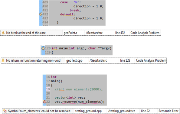 The figure below shows a few examples of Codan in action. While typing in code, a gold (warning) or red (error) bug icon appears adjacent to the line number of the crappy code you write.