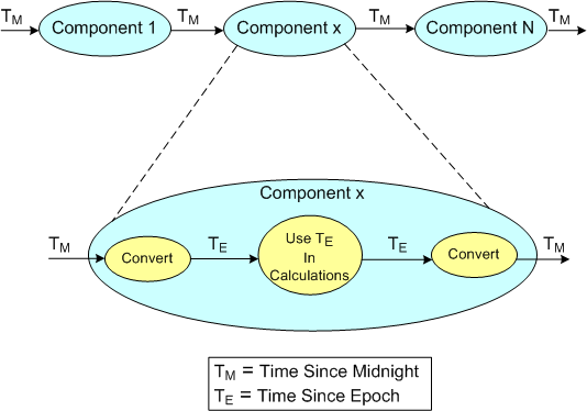 Assume that you know what the next two logical steps are:  1) change the specification of all the time fields in the messages exchanged between the system components from the midnight reference origin to the unix epoch origin, 2) remove the unessential  input/output conversions: