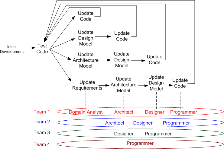 In the simplest defect/enhancement case, the code is the only product artifact that must be updated and tested. In the most complex case, the requirements, architecture, design, and code artifacts all “should” be updated.