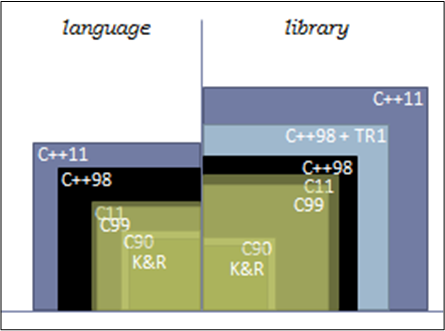 Yes, that’s C++11 down in those tiny blue boxes. WTF! Note that the core language specifications on the left side of the chart are roughly the same size.