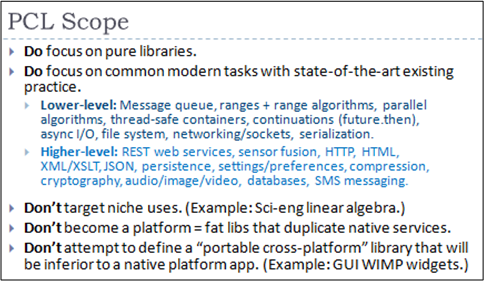 To address the issue, Herb proposed the formation of a an open-source Portable C++ Libraries (PCL) organization with the following guiding principles: