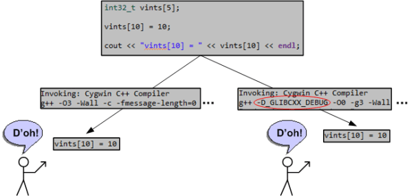 The reason is “range checked access during runtime“; and I don’t mean using std::vector::at() all over your code. Stick with the more natural std::vector::operator[]() member function at each point of use, but use -D_GLIBCXX in the compiler command line of your “Debug” build configuration. (Of course, I’m talking about the GCC g++ compiler here, but I assume other compilers have a similar #define symbol that achieves the same effect.)