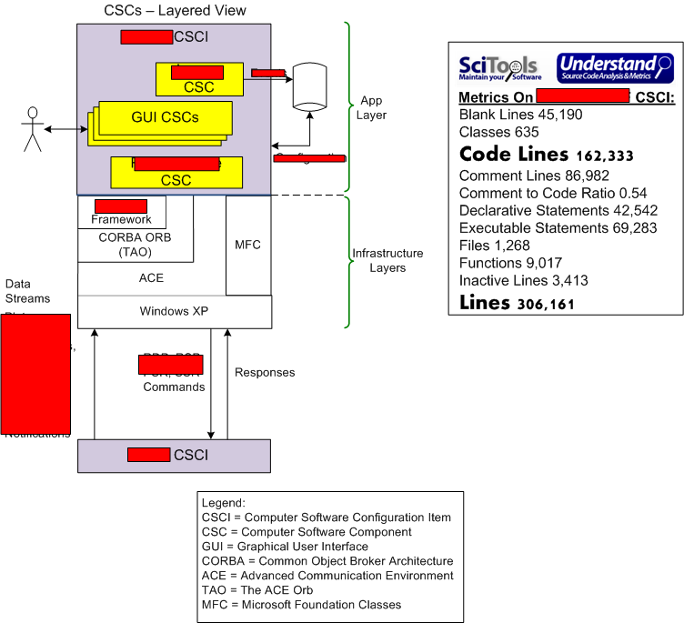 For your viewing pleasure, I’ve sketched out the structure and provided some code-level metrics on the software-intensive product that I recently started working on. Of course, certain portions of the graphic have been redacted for what I hope are obvious reasons.