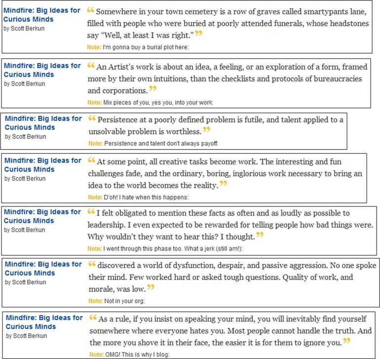 I just finished reading Scott Berkun’s fourth book, “Mindfire: Big Ideas for Curious Minds“. It was as delightfully painful to read as the other three of his books that I’ve read. Here’s what I mean by “delightfully painful“:
