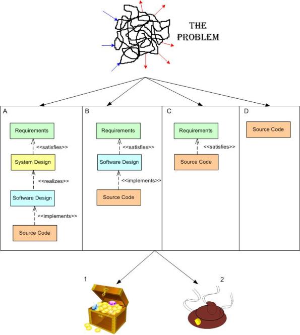 Ouch 🙂 I think your points about reqs/design sources, development methodology, testing strategy apply to any/all of the 4 (or more?) paths. Those choices, and how they’re executed, certainly “influence” whether outcome number one or two is achieved. But there is no guarantee of anything. For a given problem, a high ceremony process overlayed on path A can fail miserably whereas a minimal, chaotic process typically associated with path D can succeed wildly.