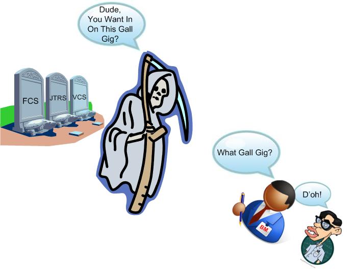 We can add the Strategic Defense Initiative (Star Wars), the FBI’s Virtual Case File System (VCS), JTRS, FCS, and prolly a boatload of other high falutin’ defense projects to the list of wreckage triggered by violations of Gall’s law. Do you have any other majestic violations you’d like to share? Can you cite any counter-examples that attempt to refute the law….