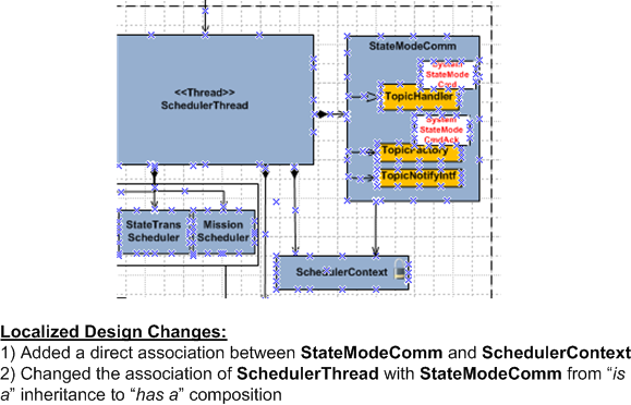 The figure below shows a portion of an initial “local” design that I plucked out of a more “global” architectural design. When I started coding and unit testing the cluster of classes in the snippet, I “discovered” that the structure wasn’t going work out. The API of the architectural framework within which the class cluster runs wouldn’t allow it to work without some major, internal, restructuring and retesting of the framework itself.