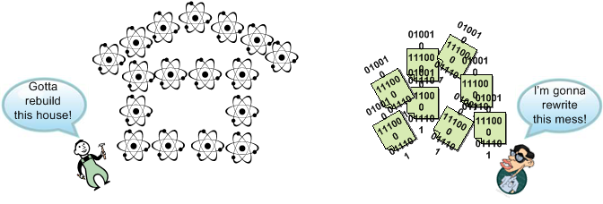 In small systems, if you discover you made a big mistake three quarters of the way through the project, you can rewrite the whole shebang in short order without having to bend metal or cut wood. But as software systems get larger, at some point the “rewrite-from-scratch” strategy breaks down – and often spectacularly. Without house-like blueprints or bridge-like schema to consult, finding and reasoning about and fixing mistakes can be close to impossible – regardless of which state-of-the-art process you’re using.