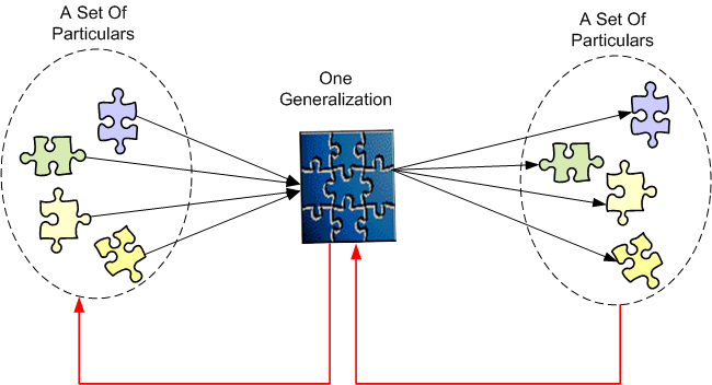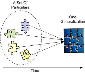 Induction is the process of synthesizing a generalization from a set of particulars; a mental step up in abstraction from many-to-one.