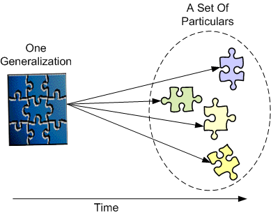 Deduction is the process of decomposing one generalization into a set of particulars; a mental step down in abstraction from one to many.