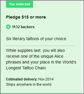 Several months ago, I signed up for a kool Kickstarter project whose goal is to create and photograph the world’s largest tattoo chain. The completed project, brilliantly conceived of by Litograph’s Danny Fein, will be comprised of over 5,000 temporary tattoos. Each tattoo is one sentence from Lewis Carroll’s classic book “Alice’s Adventures in Wonderland“.