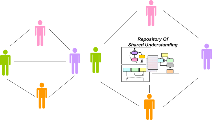 The system on the left, which depends (almost) solely on face-to-face collaboration, is the “agile” way. The system on the right, designed around a living, breathing, Repository Of Shared Understanding (ROSU) and supplemented by face-to-face conversation, is the “traditional” configuration.