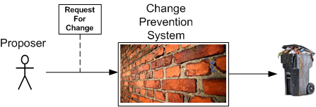 If, over time, you keep adding more and more evaluation rules to your system and imposing more and more pre-conditions (e.g. requiring a formal ROI analysis paper) on your proposers, your system’s latency will keep rising and its effectiveness at managing change (accepting the good and rejecting the bad) will keep decreasing. People will conclude that it’s just not worth their time to traverse your bureaucratic gauntlet. In the extreme case, your system will automagically morph from a change management system into a change prevention system – and you may not even know that it has happened.