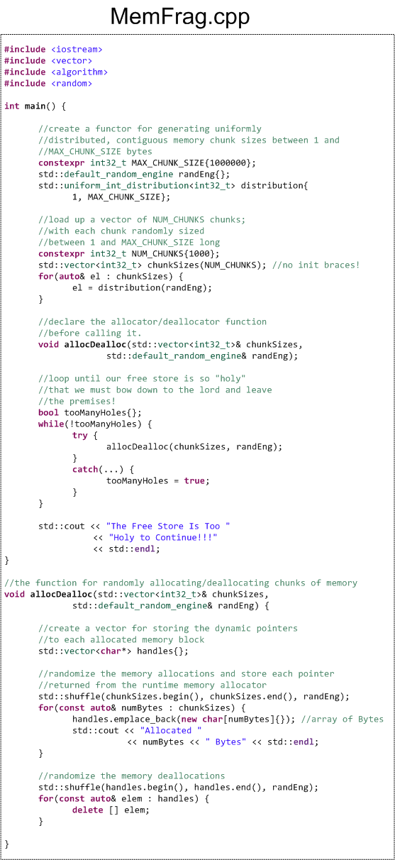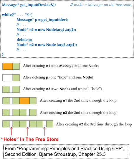 Since C++ (by deliberate design) does not include a native garbage collector or memory compactor, programs that perform dynamic memory allocation and de-allocation (via explicit or implicit use of the “new” and “delete” operators) cause small “holes” to accumulate in the free store over time. I guess you can say that C++ is “holier than thou“. 😦 Stroustrup Mem Holes Mind you, drilling holes in the free store is not the same as leaking memory. A memory leak is a programming bug that needs to be squashed. A fragmented free store is a “feature“. His holiness can become an issue only for loooong running C++ programs and/or programs that run on hardware with small RAM footprints. For those types of niche systems, the best, and perhaps only, practical options available for preventing any holes from accumulating in your briefs are to eliminate all deletes from the code: