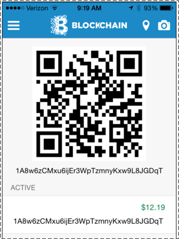 The following figure shows the home screen of my iPhone Blockchain wallet app at the time of this writing.  To test out and evaluate the wallet’s feature set and UI, I sent approximately $13 USD worth of BTC from one of my PC wallets  to my Blockchain app wallet. As you can see, the bottom transaction shows the reception of $13.27 USD worth of BTC at my Blockchain wallet’s public address (1Ni….vvC).