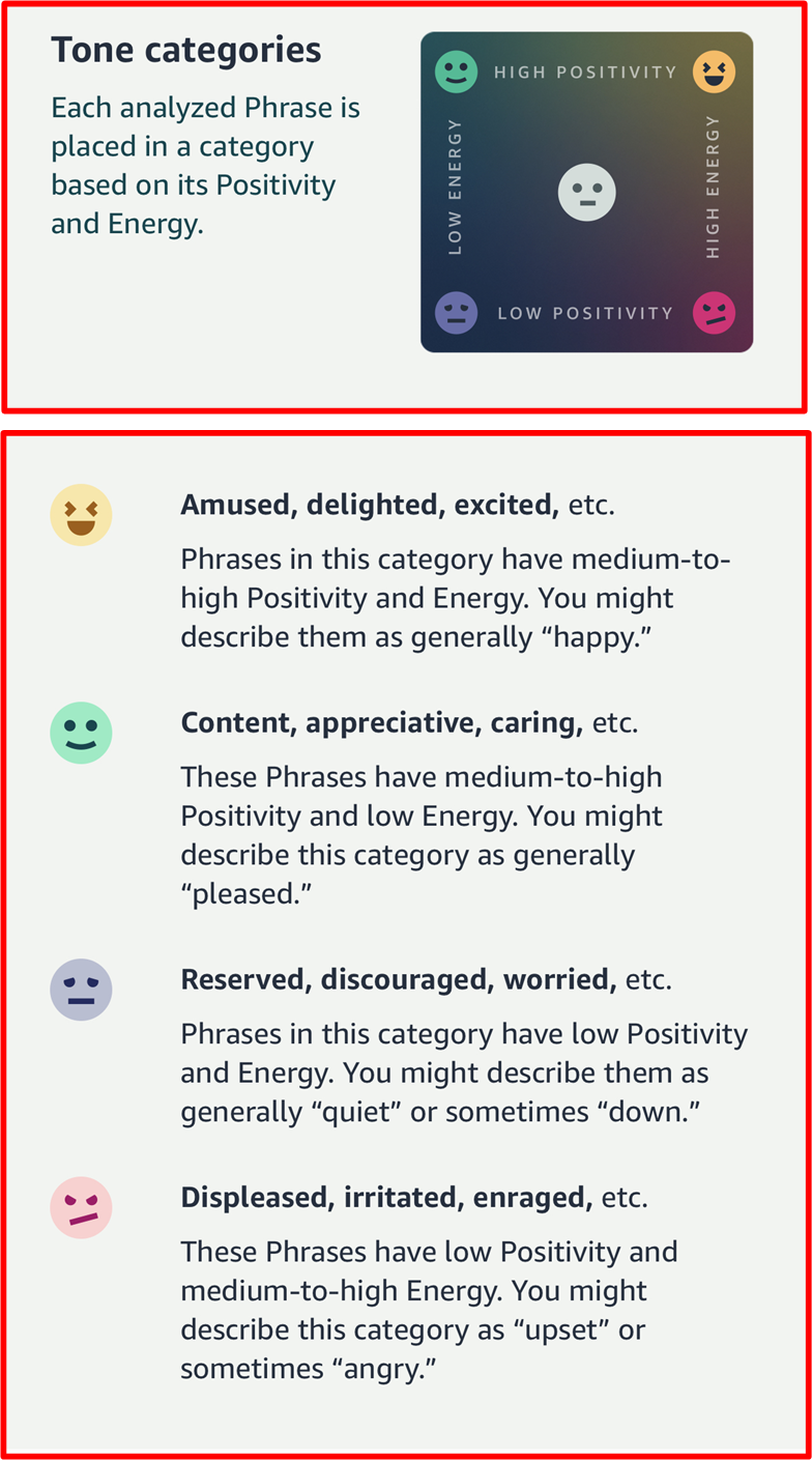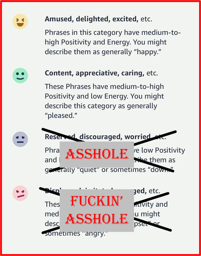 Now, if BD00 was director of Amazon Halo product development, his “tone” categories would be as follows: