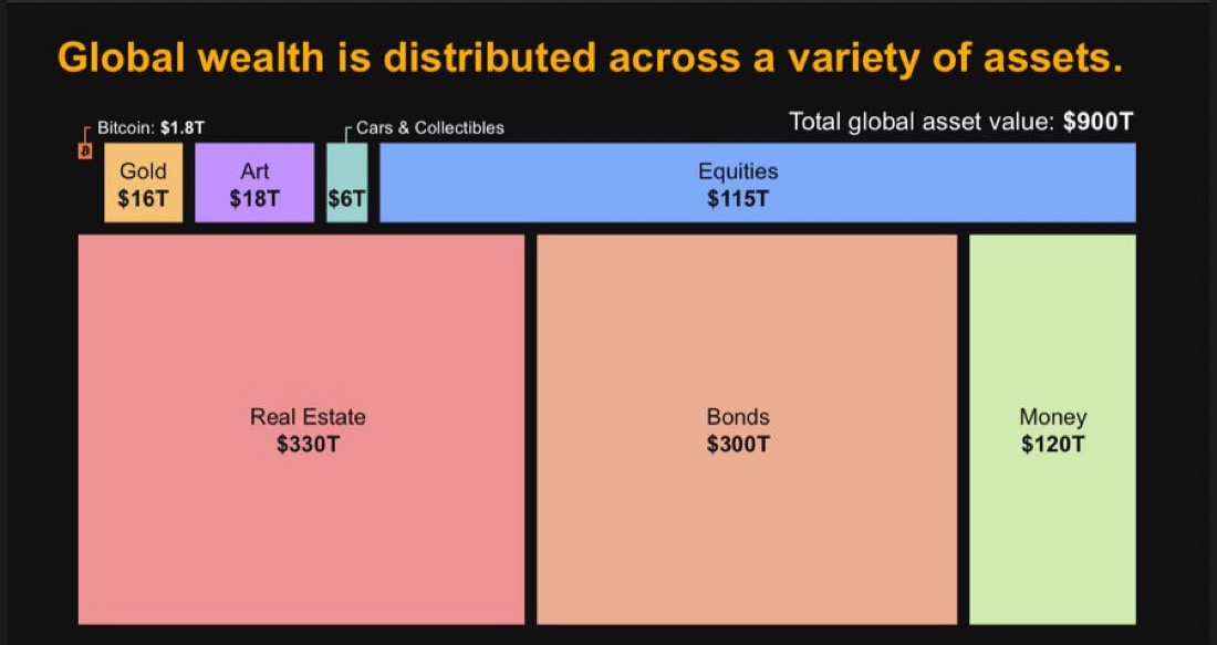 In the top left corner we see a tiny sliver of the monster $900T asset market value currently stored in Bitcoin’s tiny little sub $2T space. A 10x rise in price from here at $90k would only stuff $20T more into the space. Hence, that’s what people mean by Bitcoin being the greatest asymmetric trade of all time and why some predict $1M Bitcoin in the not too distant future.
