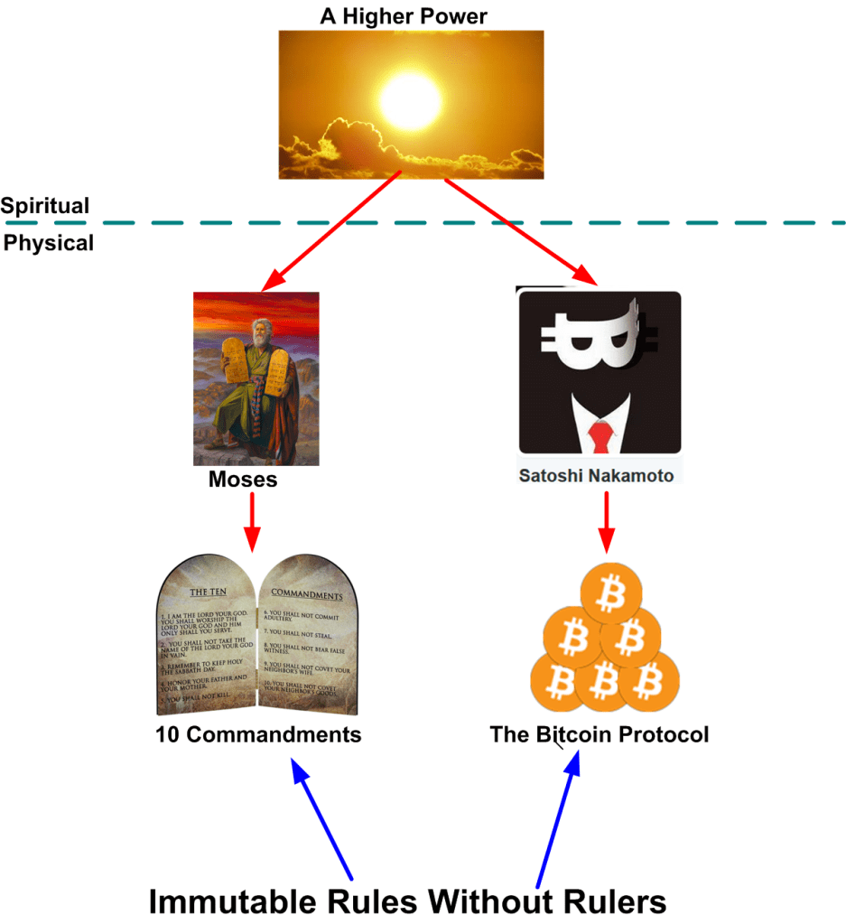 The intent is to postulate the path from energy -> thought -> words(code). The updated picture shows that Moses and Satoshi were animated by a universal life force from a mysterious layer “above them“, which represents a higher power of your choice (Yahweh, Allah, Gaiea, Tao, Zeus, etc.) Thus, they were lucky conduits to two world-changing ideas birthed for man, from no-man.