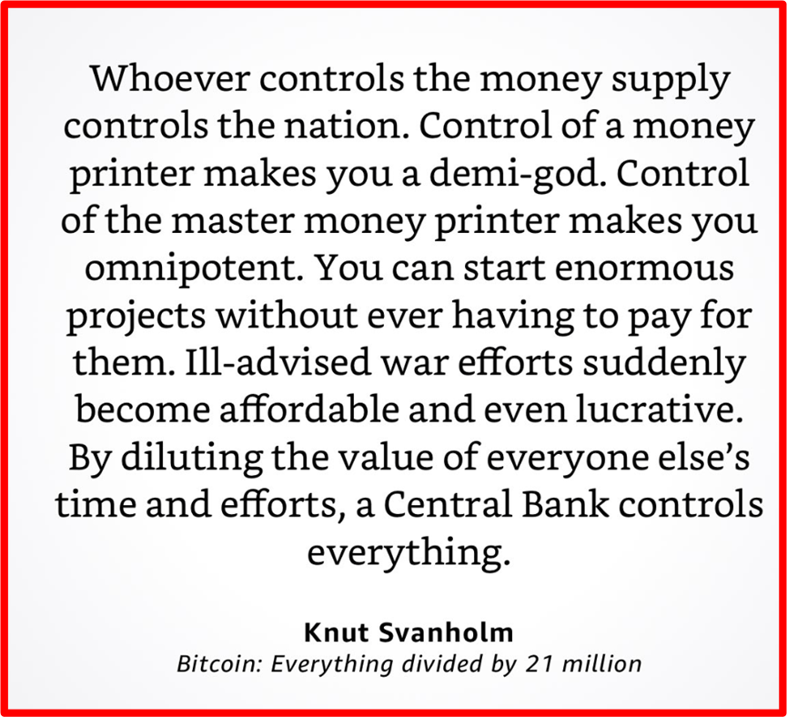 Before my obsession with Bitcoin took hold, I took it for granted that government should control a nation’s fiat money supply. Hey, we should “trust” those we elect to be doing the right thing with our taxes and savings, no? That is the way it’s supposed to be, damnit! After diving deeper, I found that history has repeatedly shown that because of human nature (you know, that pesky Dawkins selfish gene), a nation’s rulers always manipulate the money supply and disrupt free markets not to “promote the general welfare” of its citizens like you, but to enrich themselves and their cronies at our expense.