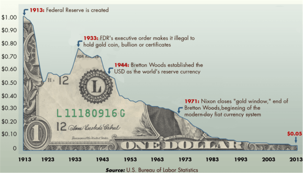 The best thinkers in this reviled school of economic thought argue how something that the vast majority of us take for granted, the control of a nation’s money supply, should not be left in the hands of the rulers (politicians + central bankers). They will, as history has shown without exception, irresponsibly debase the nation’s fiat money (fiat means: you must use the paper money we control to pay taxes or else you will get rekt) over time by printing more of it whenever it’s politically expedient to fund their pet projects and wars instead of having the guts to impose taxes to pay for them. The pic below shows what inflation, via central bank and government collusion, has done to the purchasing power of the US dollar over 100 years.